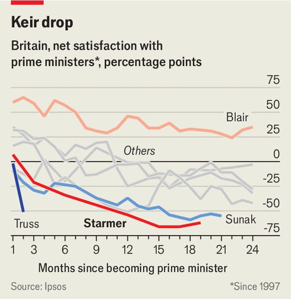 As you can see, Starmer has managed to surpass the unpopularity of all prime ministers since then. No mean feat, given the competition - or the fact that, in the last 10 years alone, Britain has been ruled by a third of its post-war prime ministers.