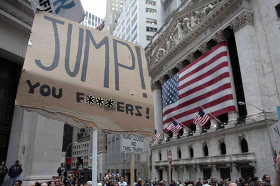 But sometimes something does not make sense, and it makes us wonder: “Woman plunges to her death from top restaurant that has become suicide spot for City (London’s Financial District) workers.” How many? Three, between 2007 and 2012; all successful members of the Financial Sector workforce, with different stories but immediately bringing up memories of stockbrokers’ mass suicides in the 1930’s crash. According to Macleansthere were 6 stock market related deaths in Wall Street during 2008. Different sources put the 1930 death tall at around 23,000. It’s one of the most deeply ingrained images of Wall Street during the crash: the distraught stockbroker out on the window ledge. During the bank bailouts in September, protesters outside the New York Stock Exchange carried “Jump you f***ers” placards.