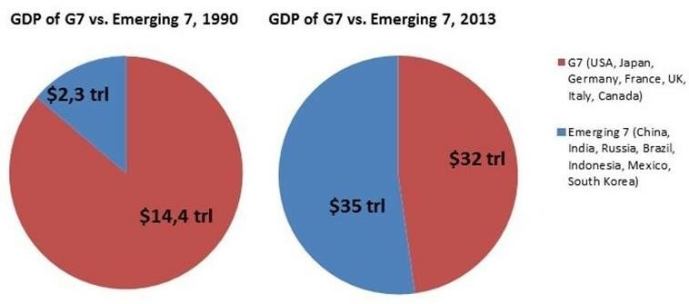 The currency USD and Euro monopolies represent the last remnants of the world hegemony of the Western powers as they are fast losing all the competitive advantages they have had over the rest of the world during the last few centuries and their colonial power. The Western economies are fast shrinking in significance relative to the rest of the world. This is demonstrated by comparing the GDP of the Western powers as represented by the G7 countries (USA, Japan, Germany, France, UK, Italy and Canada) with the GDP of emerging powers of today. (Exhibit 7). As recently as 1990, the combined GDP of the G7 was overwhelming in relation to that of today’s 7 emerging powers: China, India, Russia, Brazil, Indonesia, Mexico and South Korea (not necessarily constituting one political block). In 1990, the G7 countries had a combined GDP of USD 14.4 trillion and the emerging 7 had a GDP of USD 2.3, but by 2013 the tables had been turned, as the G7 had 32 trillion and the emerging 7 had 35 trillion. Just imagine what the situation will be ten years from now! This is one of the West’s greatest fears.