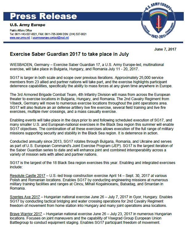 Het Amerikaanse leger en haar NAVO bondgenoten brengen deze zomer 25.000 militairen op de been voor een grootschalige militaire oefening bij de Zwarte Zee. Deze oefening, genaamd Saber Guardian 2017, moet in juli plaatsvinden in de landen Bulgarije, Hongarije en Roemenië.