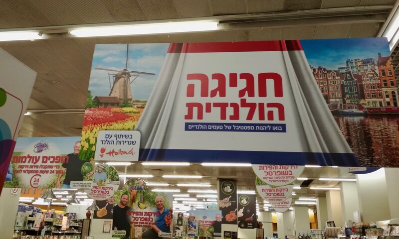 Signs promoting Dutch food month, “in partnership with the Netherlands embassy” at a Shufersal store in Gilo, an Israeli settlement in the occupied West Bank, 12 November.