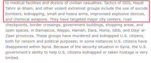 The armed opposition group, Hayat Tahrir al-Sham (HTS), is referenced early in the document: “Terrorist and other violent extremist groups including ISIS and Al-Qaeda linked Hayat Tahrir Al-Sham [dominated by Al-Qaeda affiliate Jabhat Al-Nusra, a designated Foreign Terrorist Organization], operate in Syria.” The document clearly names terrorist groups operating in Syria who use tactics such as suicide bombings, kidnappings and chemical weapons – to target major city centres and open spaces.