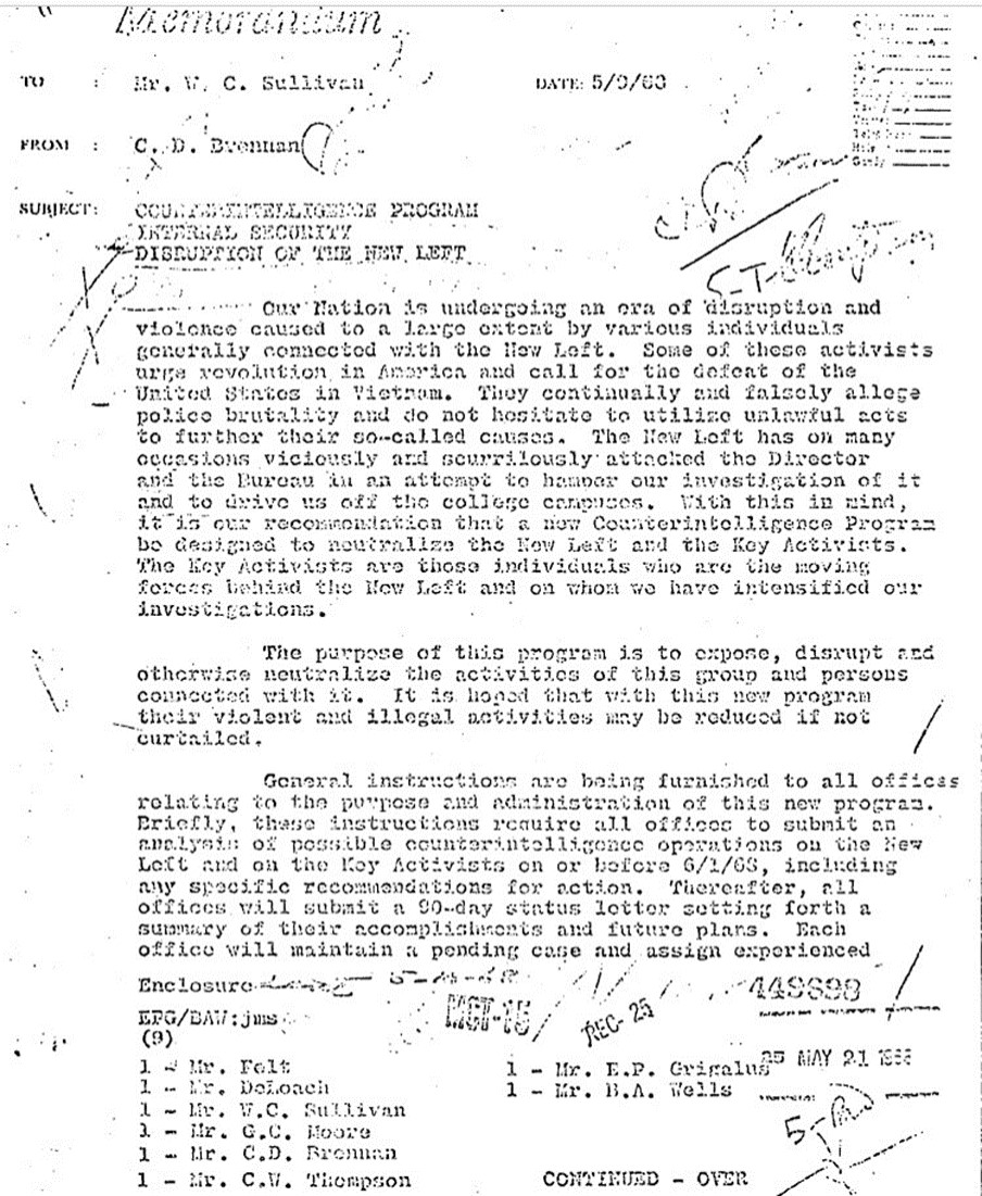 - In May, 1968, clearly in an act directly related to the actions noted above, the FBI’s “intelligence” gathering program COINTELPRO – previously used by the FBI to track Martin Luther King Jr. and assorted other targeted civil rights activists and suspected communists – was extended widely, to track anti-war and civil rights protestors under a comprehensive, country-wide and highly illegal program that had already been growing in breadth and depth throughout the turbulent 1960s. All field offices were sent a memorandum describing their responsibilities under the program, including identifying potential subjects and reporting results of their surveillance activities on a three-month interval. The FBI memorandum describes the program thusly: General instructions are being furnished to all offices relating to the purpose and administration of this new program. Briefly, these instructions require all offices to submit an analysis of possible counterintelligence operations on the New Left and on the Key Activists on or before 6/1/68, including any specific recommendations for action. Thereafter, all offices will submit a 90-day status letter setting forth a summary of their accomplishments and future plans . . . “