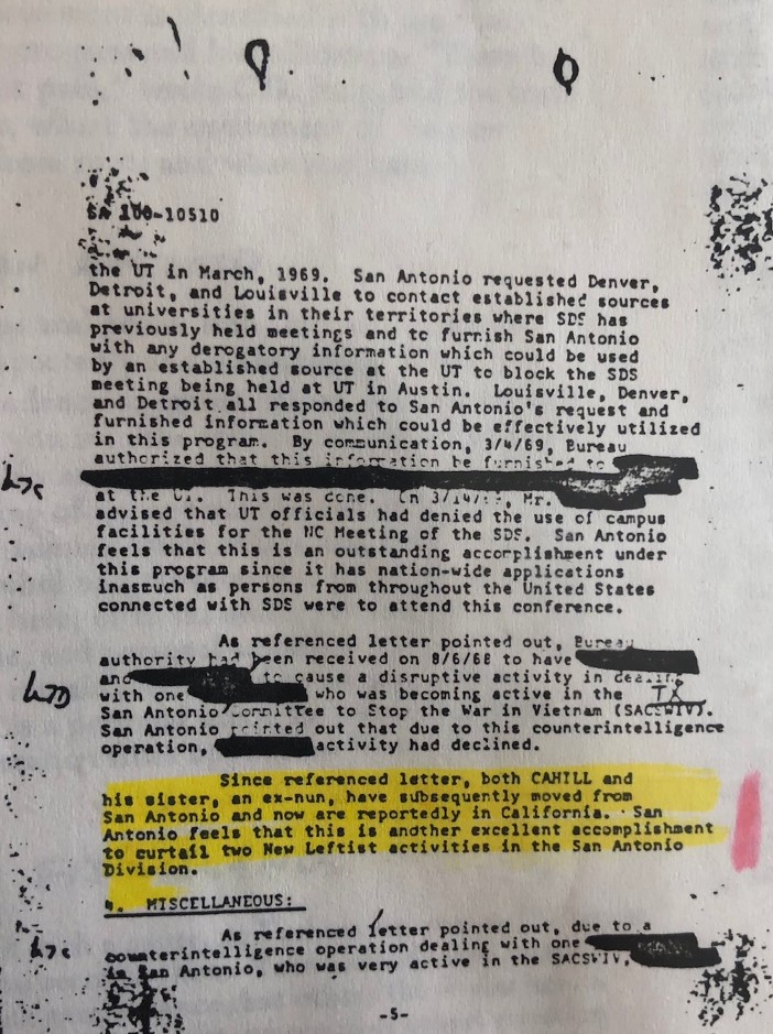 Soon after his release, in February, 1969 Cahill and his sister moved to California. One month later, the SAC from San Antonio sent the following multiple page letter to HQ (or “S.O.G.”) boasting about how they had driven the Cahills out of their city: “San Antonio feels that this is another excellent accomplishment to curtail two New Leftist activities in the San Antonio Division.”