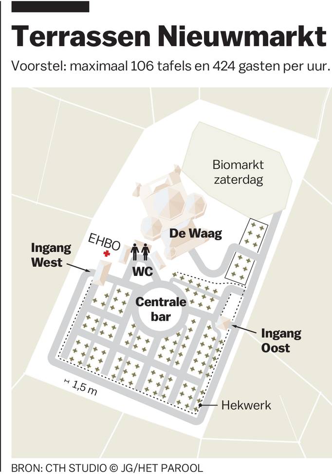 Eerst 25 tafels, 100 gasten maximaal, die stuk voor stuk reserveren via een app. Niet meteen volgende week al, als de horeca weer voorzichtigjes open mag, maar vanaf 17 juni. Een intelligente première, noemt initiatiefnemer Barry van den Berg de terrasplannen voor de Nieuwmarkt. "Als je nu meteen voluit gaat, weet je zeker dat er problemen komen." Een gecontroleerd terras moet het worden, veilig voor de gasten, het personeel en de omwonenden.