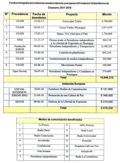 On June 2, Journalist William Grigsby on his news analysis program, Sin Fronteras, revealed (see below) US documents which show that the CIA openly channeled US$16.7 million for the coup attempt, between February 2017 and July 2018, through the Violeta Barrios de Chamorro Foundation whose director Cristiana Chamorro is part of a famous family of oligarchs that count eight members as previous presidents; she is also the daughter of former president Violeta Barrios de Chamorro. She and her uncle are owners of the only daily, La Prensa, funded by the US for pro-Contra lies since the 1980s. Her brother Carlos Fernando has his own media empire. US funds to the VBCHF support these family businesses. Her now-deceased husband, Antonio Lacayo is widely considered to have exercised great power during her mother’s presidency from 1990 to 1997 overseeing some 7 billion dollars in privatization of state property, as well as privatization of education and health care. During the early 90s you couldn’t get so much as an aspirin at a government hospital without paying for it.