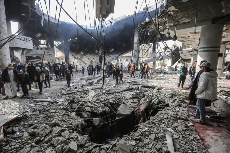 Palestinians in the ruins of al-Huda mosque, destroyed in Israeli bombing overnight, in Rafah, southern Gaza, 12 February.