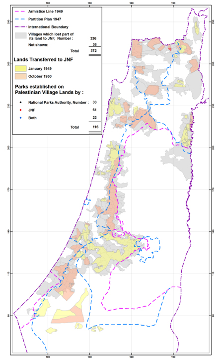 But the major robbery was undertaken by JNF. Ben Gurion felt, after Bernadotte’s damning report, that the international community would force the un-recognized Israel government to allow the refugees’ return to their homes. So Ben Gurion entered into a fictitious sale’s agreement of the choicest Palestinian land with JNF. He could then claim that this land is out of his reach. It belongs to an international organization with a different jurisdiction. [Slide-29 A, B, C] JNF confiscated the land of 372 villages, owned by 54% of the refugees. JNF honoured Balfour, Lloyd George and western accomplices by planting parks on this land named after these notables. [Slide-30] This slide shows the park paid for by Canadian Jews, on the ruins of Biblical Imwas, Bayt Nuba and Yalu destroyed by Rabin in 1967.