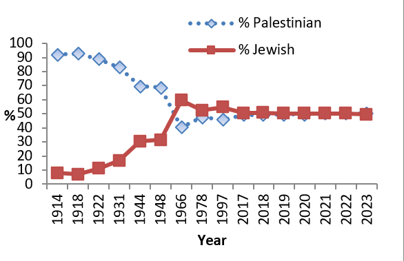 Percentage of Palestinians and Jews in Historical Palestine in Various Years
