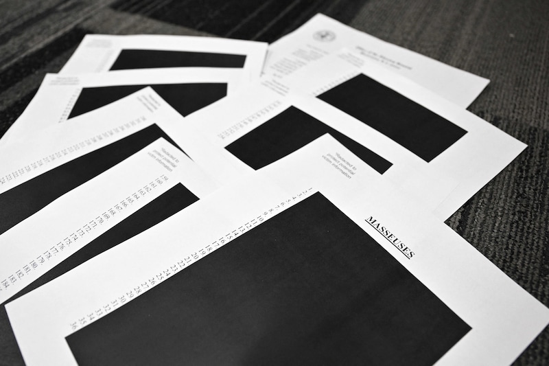 Het ministerie van Justitie heeft verschillende van de vrijgegeven documenten zwaar bewerkt, onder meer om slachtoffers beschermen. Dat ziet er dan bijvoorbeeld zo uit. Op een papier met de kop 'Masseuses' is verder enkel een groot zwart vlak te zien.