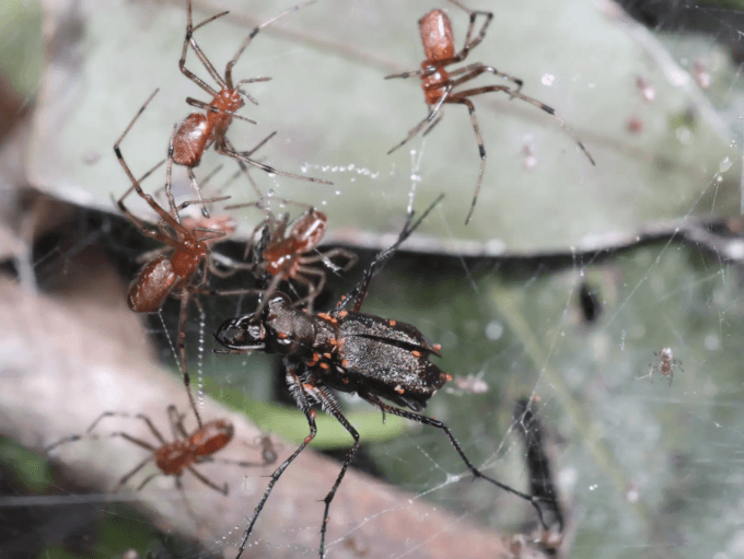 A tiger beetle fighting for its life in a social spider web.