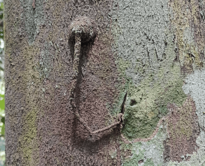 The next morning, Ross, the two Colombian students, and I walked out on the trail that paralleled the river. We were in pursuit of a particular kind of caterpillar that the Ross suspected was a new species, undescribed by science. This caterpillar, a larval moth, constructs a strange mobile dwelling for itself on the smooth trunks of trees: a tube composed of silk and leaf fragments, attached to the bark at one end and hollow, with a curious domed structure at the far end. The caterpillar uses the dome as a refuge within which it can graze the algal growths on the trunk while remaining invisible to the innumerable predators that flit and crawl through the midstory of the forest. Although there was another similar caterpillar species with a similar nest that had been scientifically described, this one had a distinctive shape and structure to the tube and dome that marked it as likely something new. We scanned the trees along the trail for specimens, and when we located one, Ross described to the grad students a structure he wanted them to build around it to capture the adult moth that would emerge after the caterpillar pupated inside the tube. To formally describe a new species, all stages of the animal’s life cycle need to be photographed and measured, and, to date, the adult of this species has been unknown. Ross tapped the distal end of the tube, where it emerged from a crack in the bark where the adult of a previous generation had laid its eggs. The tubes and nests are sold in markets as love charms, he said, and the vendors tell customers that they’re made by lizards. Supposedly, you take one of the tubes and put it under your lover’s pillow when you’re having a fight, and in the morning, she’ll be amicable towards you. Do people make a lot of money off selling those, I asked. I don’t know, said Ross, shrugging. They probably make enough to make it worth it.