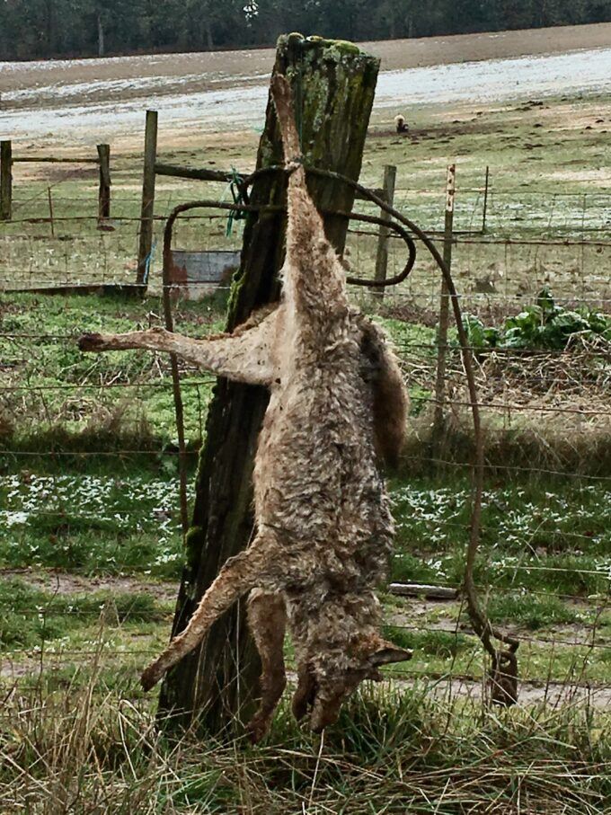 +This coyote had been shot and strung up as a trophy on a fencepost in Oregon’s French Prairie.